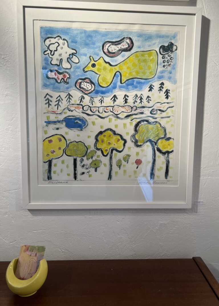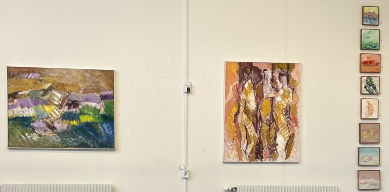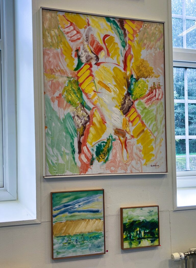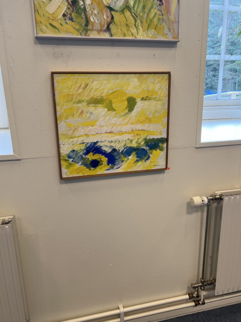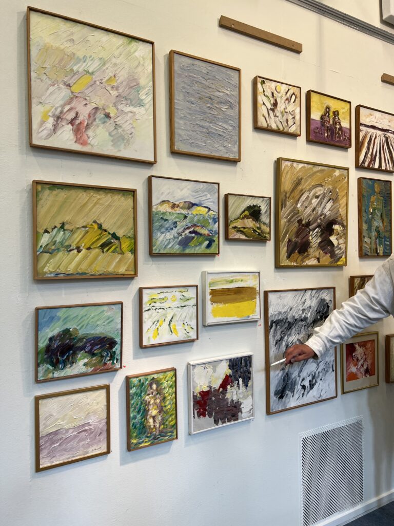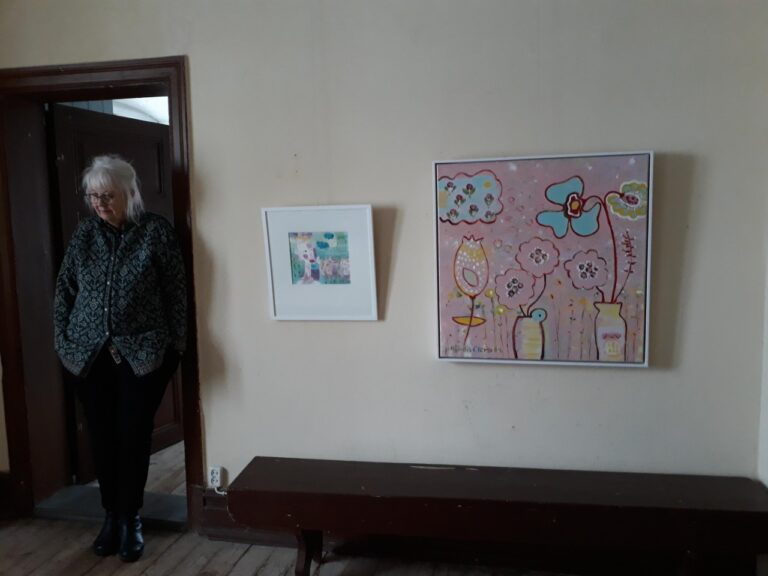 Hjördis bjöd på inspirerande tavlor i sitt charmiga hus med 100 år på nacken. Här gjordes inköp till konstföreningens utlottning vid årsmötet mars 2026.